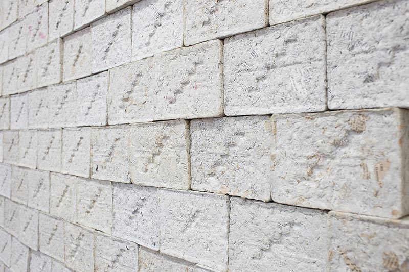 This project is an installation of varying scale, made of paper bricks made of thousands of shredded pages of French and bilingual dictionaries. The bricks are stamped with an Egyptian hieroglyph meaning “to go up”; their arrangement remains open as they are not cemented.